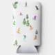 Cool whimsical illustration art of colourful snowboarders, snowboarding downhill in mountains among pine, spruce, and pine trees on fresh snow powder. Snowboard and Xmas outdoor sport in a winter forest. Snowboarder gifts. Snowboarding design for him