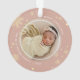 This holiday season, commemorate a special year with this elegant personalised photo Christmas ornament. A modern snowflakes framing your favourite photo in round format with holiday greeting and family name, year text curving around. Add a second photo to the reverse side.
