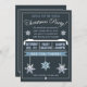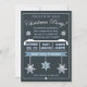 Annual Christmas Party Invitation with a modern feel. Shades of blue and white with snowflakes, snow piles and banner ribbon on front.