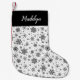 Modern chic black and white stocking features a snowflake pattern with your name or monogram at the top in white calligraphy script lettering.