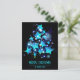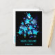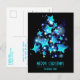 The postcard features a stunning, abstract Christmas tree illuminated by a cluster of sparkling blue stars and bright, celestial lights. Set against a deep, dramatic black background, the vivid turquoise and sapphire tones pop, creating a mesmerising, galaxy-inspired winter scene.