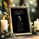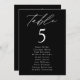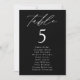 Elegant wedding seating chart featuring "table" displayed in white calligraphy script with the table number and guest names shown below on a black background with subtle white specks. The design repeats on the back. To order the table number seating chart, edit each card with the table number and guest names and add it to your cart. Designed to coordinate with our Modern Elegance wedding collection.