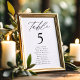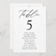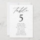 Elegant wedding seating chart featuring "table" displayed in black calligraphy script with the table number and guest names shown below on a white background with subtle black specks. The design repeats on the back. To order the table number seating chart, edit each card with the table number and guest names and add it to your cart. Designed to coordinate with our Modern Elegance wedding collection.