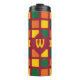 Modern spicy colours monogram thermal tumbler with geometric squares in yellow, green and orange, against a burgundy background. Matching items are available for a coordinated look. Personalise by adding your monogram at the front.