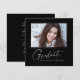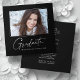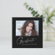 Modern square minimalist design, elegant "Photo" graduation announcement cards, featuring elements of modern text with a unique calligraphy ink script in white for darker background colour choices. The graduate's photo on the front of the card is accented with a delicate & minimalist gradient boarder. The back of the card offers personalised text spaces for information about your graduation. Black & White or easily customise the background to match your school's primary colour or any colour of your choice. Perfect for the high school, college and university grad student seniors.