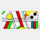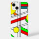 This phone case has a mid-century modern design of a stained-glass look with black lines and circles filled with primary and secondary colours.