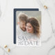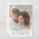 Announce your wedding date in unforgettable style with these elegant and modern photo save the date cards, featuring a full bleed vertical or portrait orientated photo with "save the date" overlaid in dusty slate blue lettering along the bottom. Your names, wedding date, and wedding location appear alongside in modern lettering. Personalise the back with additional details, such as your wedding website.