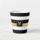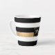 Modern chic latte mug done in a bold black, white and gold tone horizontal stripe pattern. A black and gold square monogram block, on the front of the mug, has a white single letter monogram ready to personalise.