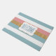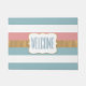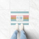 Chic front door mat done in a pink, white blue and gold striped pattern. A white decorative text area, in the middle of the mat, has blue text ready to personalise. What a lovely way to welcome guests to your home.