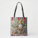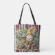 A Beautiful Women's Tote Bag For Travel Or Shopping Patterned In Modern Red And Grey Stripes With Cute Gnome And Lily Of The Valley Flowers