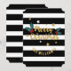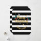 Elegant modern christmas greeting card design. Black and white stripes background. Merry Christmas modern font text design in gold glitter with green christmas evergreens accent. Gold white and black stars. It is simple elegant and trendy design.