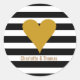 An elegant black and white striped round sticker featuring a gold heart with matching gold text for you to personalise with your own name(s) or messsage. Perfect for weddings, bridal showers, baby showers, baptisms, engagement parties, anniversary celebrations, graduations, birthday get-togethers and other special events throughout the year! Designed by Thisisnotme©