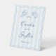 An on-trend Cards & Gifts pedestal sign for a seafood-themed event or party / shower based around a seafood boil. The sign features modern stripes in coastal tones of pale blue and white, a wavy line border and hand-drawn lobster crab and shrimp doodle-style illustrations. All colors of all elements can be customized to match your event's colors!