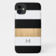 Elegant iPhone 11 case, with a modern bold white, black and gold horizontal striped pattern. Personalise the one letter monogram as a great gift idea.