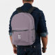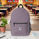 A bold and beautiful backpack design with a stylish layout of your name and monogram with classic serifs and a more ornate script typography in a balanced symmetry. The three elements blend together with a sophisticated harmony and create your own personal branding logo. Shown here with a trendy purple background with monogram elements in white and grey. This item makes a great gift for her. Great for back to school, short travel, running errands, hiking or exercise and more.