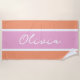 This Striped Pink and Orange Custom Name Beach Towel features an orange, pink and white simple striped background. Personalise it with your name, in a simple, stylish white script font.