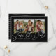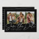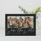 With three vertical photos and a modern script written "save the date," this card is the perfect way to announce your engagement and upcoming wedding to friends and family. The chic white text is bold and modern but still sophisticated. The customisable text on the front has room for names, date, location and other information like a wedding website. The back is a matching black and white striped pattern. The colour is editable by clicking "Customise."