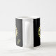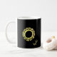 Modern stylish Sun with twelve swirling rays design on black background coffee mug. Text can be personalised.