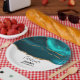Birthday paper plates with an abstract style. Illustration of teal agate stone with layers of varying shades.