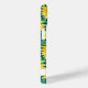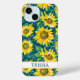 Customise this colourful modern sunflowers on teal painting iPhone 15 case with your your name in a trendy modern CAP font in teal on white. It's so beautiful and happy!