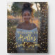 Sweet sixteen party welcome sign with photo, with a digital gold stars frame, modern fonts. Tabletop sign