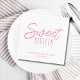 Modern pink Sweet Sixteen paper napkins. The text on the napkins can be personalised, making it a perfect fit for a girls 16th birthday party celebration. The customisable feature allows for adding names, dates, special messages, or any other relevant information to make the event more special. Matching items available. Please use the message me button below for help with further customisation and special requests.