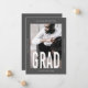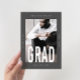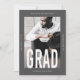 Modern and minimal grey and white one photo graduation announcement features grad in big type, and a stylish overlay.