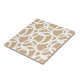 A modern abstract pattern with unevenly shaped white lines curving and crossing each other in ringlet-like shapes on tan background.