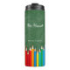 A modern personalised tumbler for teachers featuring a green chalkboard background with colourful coloured pencils. Teacher's Name in Script. Custom text at bottom in a serif font.