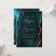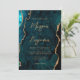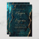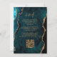 This elegant wedding invitation features a background image of teal blue watercolor agate trimmed with faux gold glitter. The customisable text combines gold-coloured modern handwriting, copperplate and italic fonts. The reverse side provides space for wedding details on a matching teal agate background, along with a QR code guests can scan to visit your website and RSVP, which saves the cost of printing and mailing separate RSVP cards.