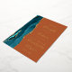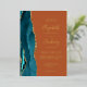 The left-hand edge of this elegant modern wedding invitation features a teal blue watercolor agate border trimmed with faux gold glitter. The customisable text combines handwriting, copperplate and italic fonts in real gold foil on a burnt orange or rust background. The reverse side features a matching teal and gold agate design.