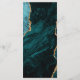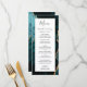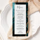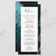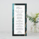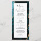 This elegant, modern wedding menu features a teal blue watercolor agate background trimmed with gold faux glitter. The text appears in elegant charcoal grey handwriting and copperplate fonts on a white rectangle. The agate design is repeated on the reverse.