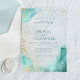 This modern abstract beach acrylic wedding invitation features trendy modern fonts with stylish script calligraphy, framed by teal and gold alcohol ink splashes.