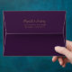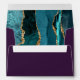 The inside of this elegant modern wedding invitation envelope features a teal watercolor agate design trimmed with faux gold glitter. Customise the back flap with the names of the bride and groom in gold-coloured handwriting script and the return address in copperplate font on a purple background.