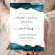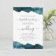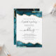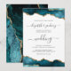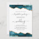 This elegant modern wedding invitation features top and bottom teal watercolor agate borders trimmed with faux gold glitter. The customisable text combines charcoal grey handwriting, copperplate and italic fonts on a white background. The names of the couple and the word "wedding" appear in cursive handwriting script with swashes at the beginning and end. The reverse side features a matching teal and gold agate design.