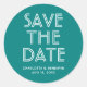 Modern teal wedding save the date sticker/envelope seal. Easily edit online with your wedding details.
