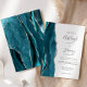 The left-hand edge of this elegant modern wedding invitation features a teal watercolor agate border trimmed with faux silver glitter. The customisable text combines handwriting, copperplate and italic fonts in charcoal grey on a white background. The reverse side features a matching teal and silver agate design.
