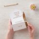 A bold stroke of deep terracotta paint, coppery golden glitter and gold dots are combined to make a modern edge for one side of this pretty invitation. The first names of the bride and groom are done in a modern calligraphy style that combines well with the modern sans serif typography also used in the design. This contemporary all-in-one design is also easy on the budget.