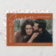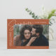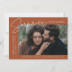 Share the news of your surprise engagement with these elegant photo engagement announcements. The design features the phrase "Surprise, we got engaged!" in a trendy white script and modern lettering on a terracotta background. Your engagement photo is featured in the centre-right part of the design with your names and engagement date displayed on the left. Personalise the surprise engagement announcement by adding additional details below such as wedding city/state, wedding website, etc. The announcement reverses to display a terracotta foliage pattern on a white background.