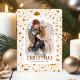 Contemporary christmas cards featuring a trendy terrazzo pattern background in earthy tones, a photo in a modern arch shape, the festive saying 'merry christmas', your family name, and the year. The photo is for display purposes only, and is designed to be replaced with your own picture.