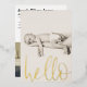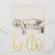 This is a modern and minimalist baby announcement template. On the front is space for your favourite full sized portrait photo with strikingly simple "hello" editable typography in real gold foil calligraphy . On the reverse there is space for a horizontal photo, newborn's name and stats along with a personal message. Customise with ease for that unique keepsake for family and friends to enjoy for years to come.