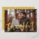 Modern Thanksgiving card featuring your horizontal photo with "Thankful" displayed in gold foil brush script lettering with your family name displayed below. The foil Thanksgiving card reverses to feature a white foliage pattern with a golden yellow background.