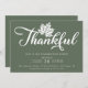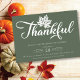 Celebrate Thanksgiving with your loved ones with this stylish and elegant invitation. The invitation features a white script calligraphy font saying "thankful" with an oak leaf set on a forest green background. The perfect way to invite your guests to a memorable evening of food, fun, and fellowship.