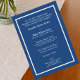 A simple navy blue card, with a bold white frame, backs a traditionally worded wedding invitation in modern white fonts. We've added a line for the names of the groom's parents. As tradition dictates, the styling is Mr. and Mrs. HOWEVER, remember this is your call. Use first names of the parents if that's what they (and you) prefer. The back is identical, bue framed in white, if you choose to keep it simple. Or this is space for your favourite photograph, along with names, date and location in a font that matches the front. The text on front is all white, in two contrasting non-cursive fonts. The back text is a soft black. The design allows you to change and reword the design anyway you choose in order to suit you and your event perfectly. Edit, add, delete. It's all yours.