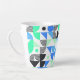 This modern latte mug features colourful seamless geometric pattern with lines and shapes in black, blue and green shades on white background.