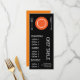 A stylish modern menu template for a modern cuisine restaurant or foodie themed dinner party. This cute menu has a cute illustration of an orange plate with cutlery against a black customisable background. The text is able to be customised to suit your needs.