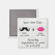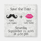 A modern and trendy save the date magnet with a moustache and lips on a background of white lace.