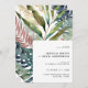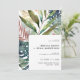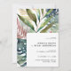 Modern wedding invitation featuring tropical botanical watercolor floral accents.