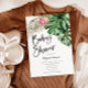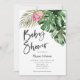 Modern baby shower invitation card featuring watercolor illustration of tropical greenery including monstera, palm leaves, pink king protea flower. Perfect for a gender neutral shower in the summer.