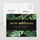 This trendy tropical change of address postcard features a frame of modern monstera and other green tropical leaves with faux gold lines on a dark, black background. The words "new address" appear in trendy, contemporary faux gold typography. A simple yet stylish moving announcement that you'll be proud to send to friends and family.